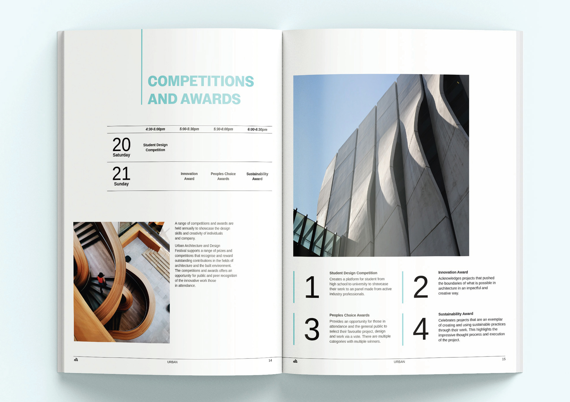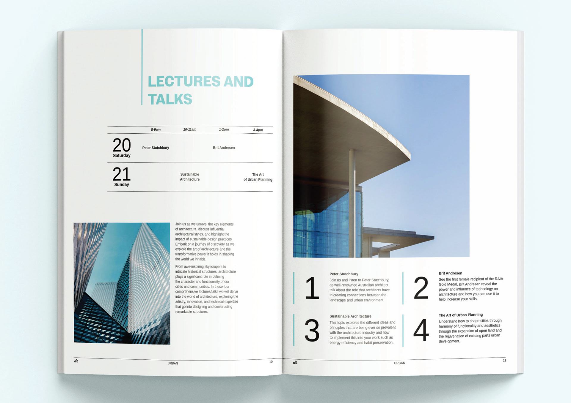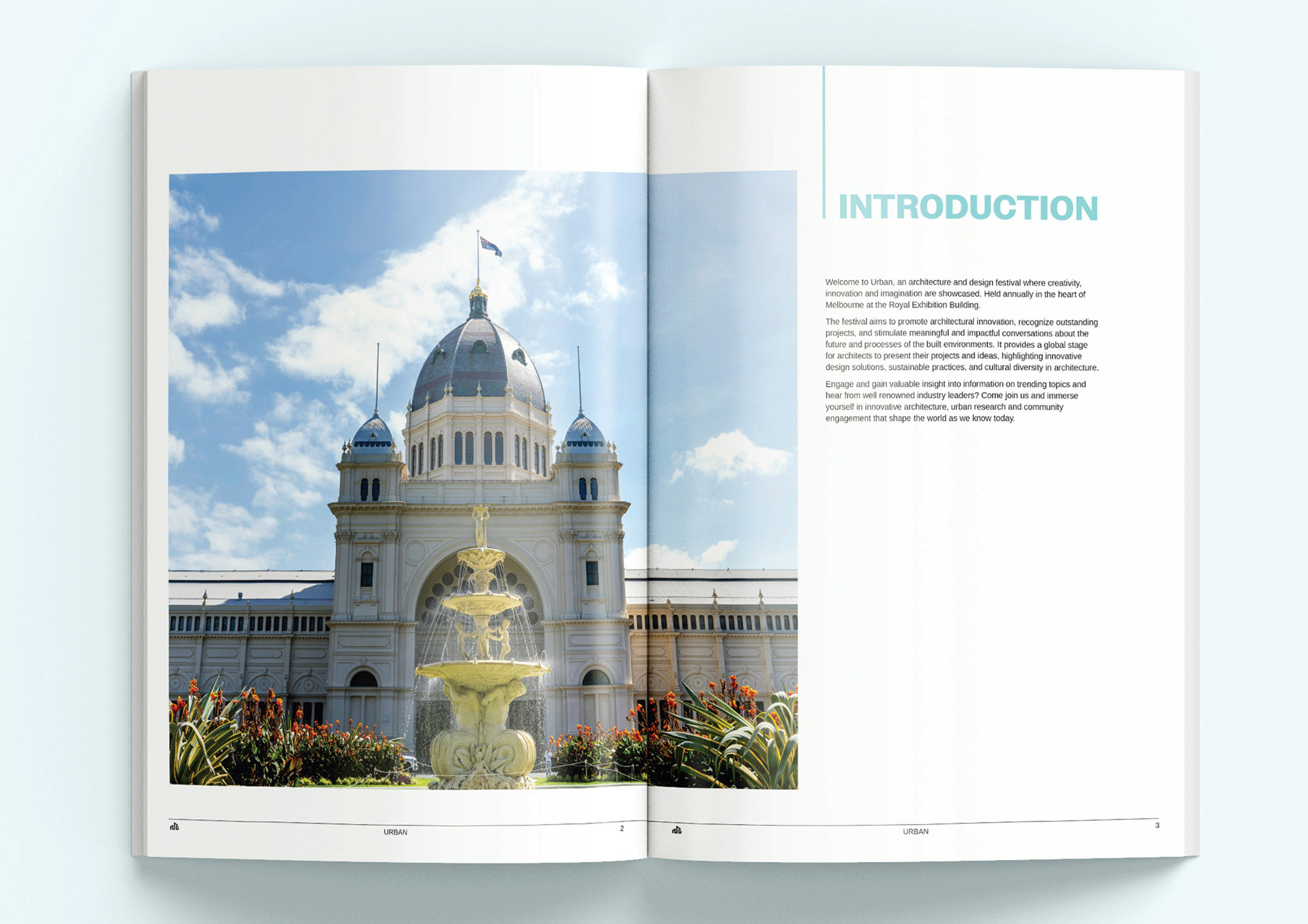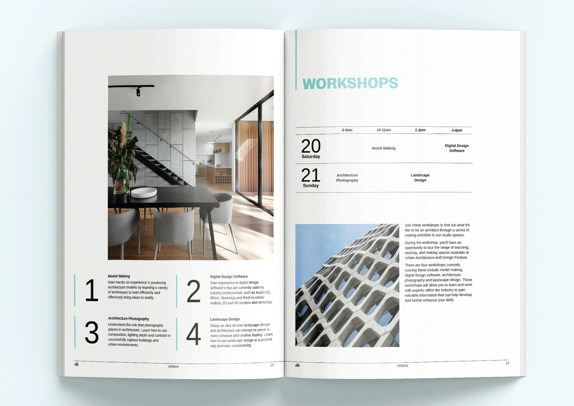 Urban requires a multi-page publication and poster for its annual architectural and design festival to bring together people within the industry, new people exploring their interests to connect and network.